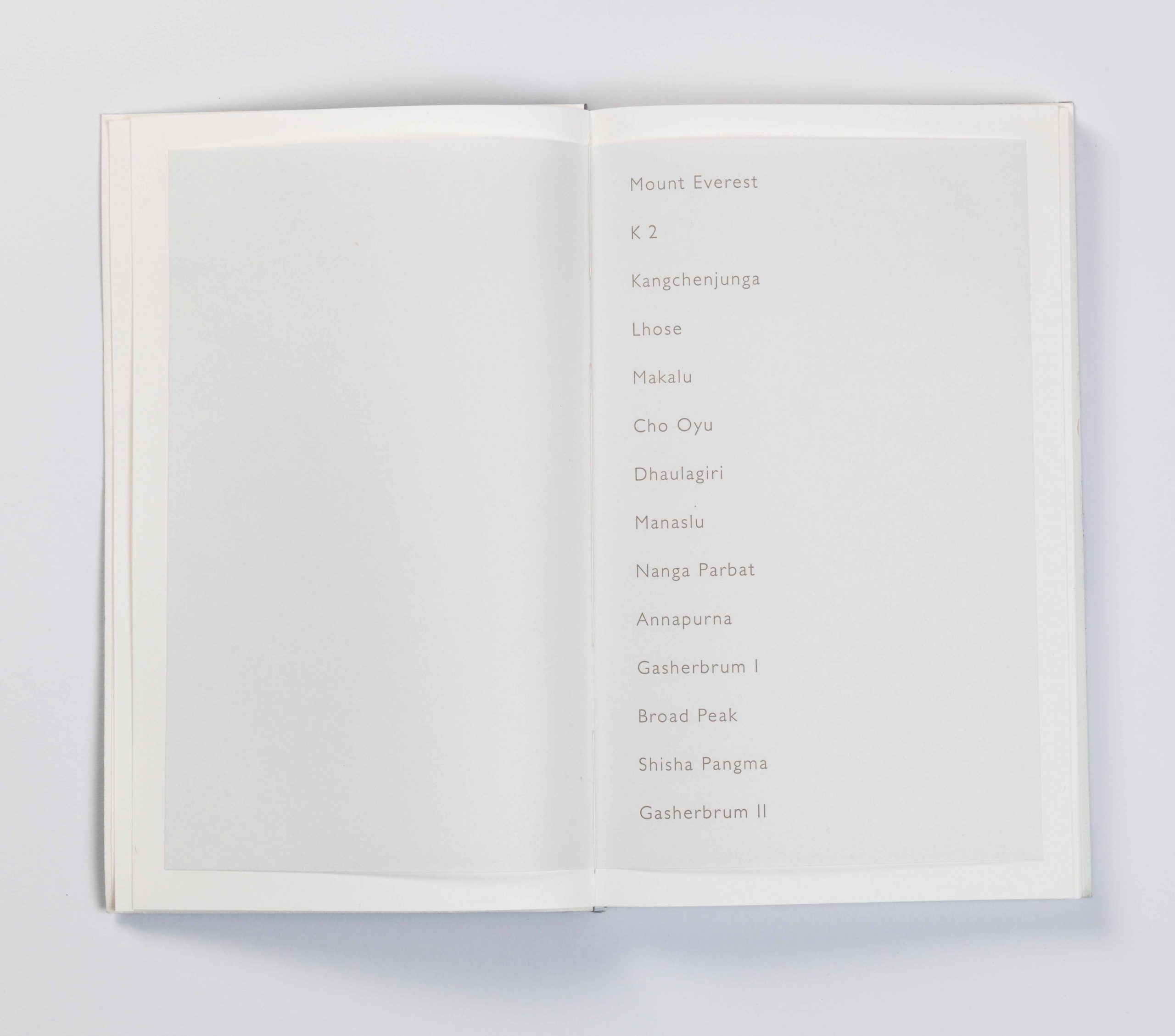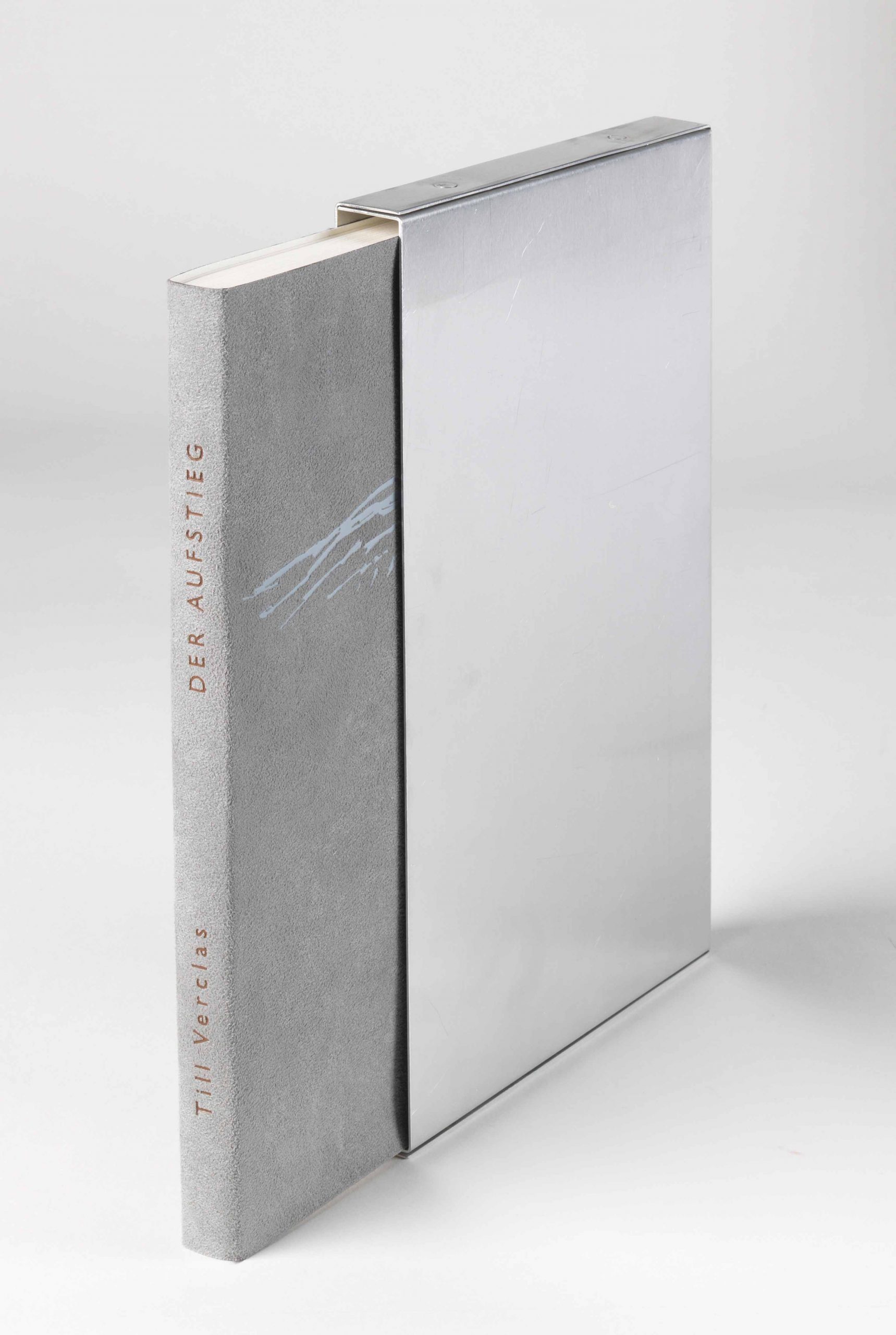 14 Hochdrucke auf Whatman Paper, jedes Motiv einem Berg der Achtausender zugeordnet. Aluschuber, weicher Velourumschlag mit Prägung, Auflage 17. Drei Bände in Leder mit Suite libre der einzelnen Motive. Einband Buchbinderei Christian Zwang, Hamburg, Aluschuber Stefan Schütz, Isen, Druck Till Verclas, Hamburg.